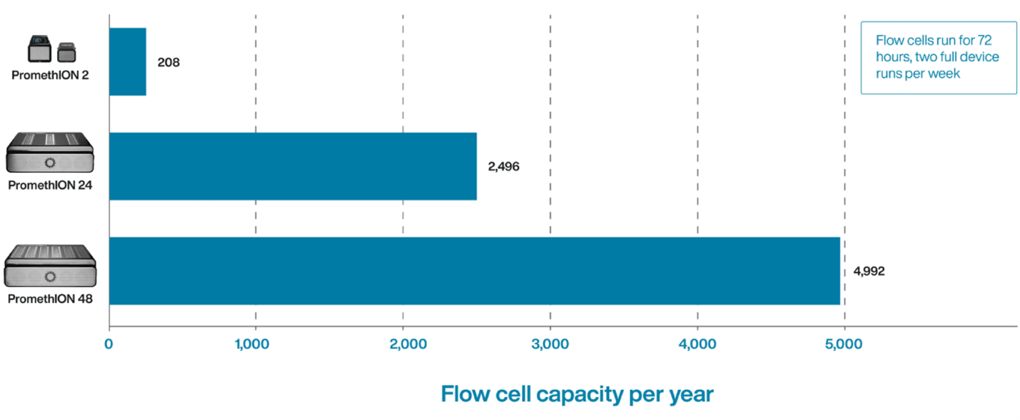 Использование проточных ячеек, которые генерируют сотни гигабаз, обеспечивают преимущества масштаба PromethION в лабораториях малого и среднего размера, включая основные и коммерческих поставщиков услуг.