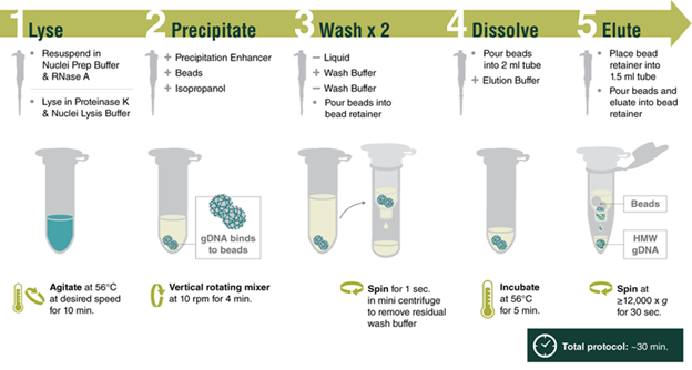Схема выделения высокомолекулярной ДНК с помощью наборов "Monarch® HMW DNA Extraction Kit", очень схожа с привычной работой на спин-колонках и включает те же этапы: лизирование, связывание ДНК, промывку и элюцию.